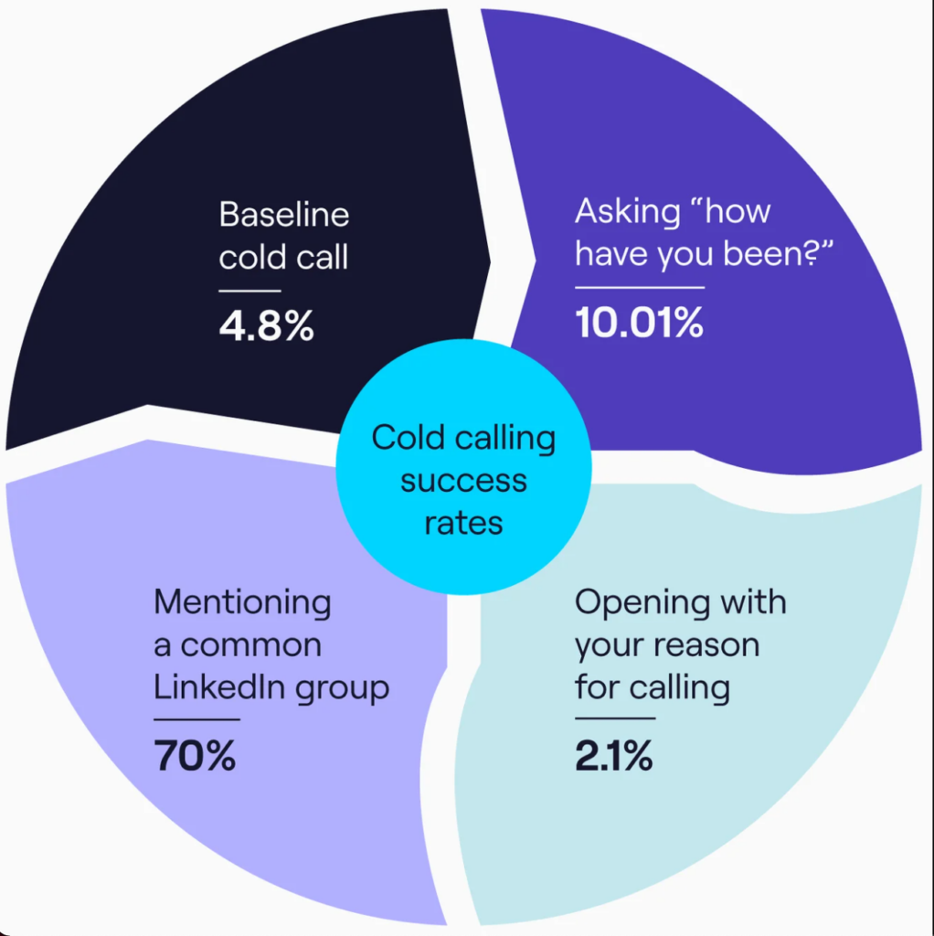 They learned that, while a baseline success rate for cold calling is just under 5%, letting people know why you’re calling increases the likelihood of success by 2.1%. Ask how they’ve been, and your chances of success increase more than 10%. Mention a common thread (in their study, it was having a LinkedIn group in common), and your chances of getting a warm lead from a cold call could increase by up to 70%.